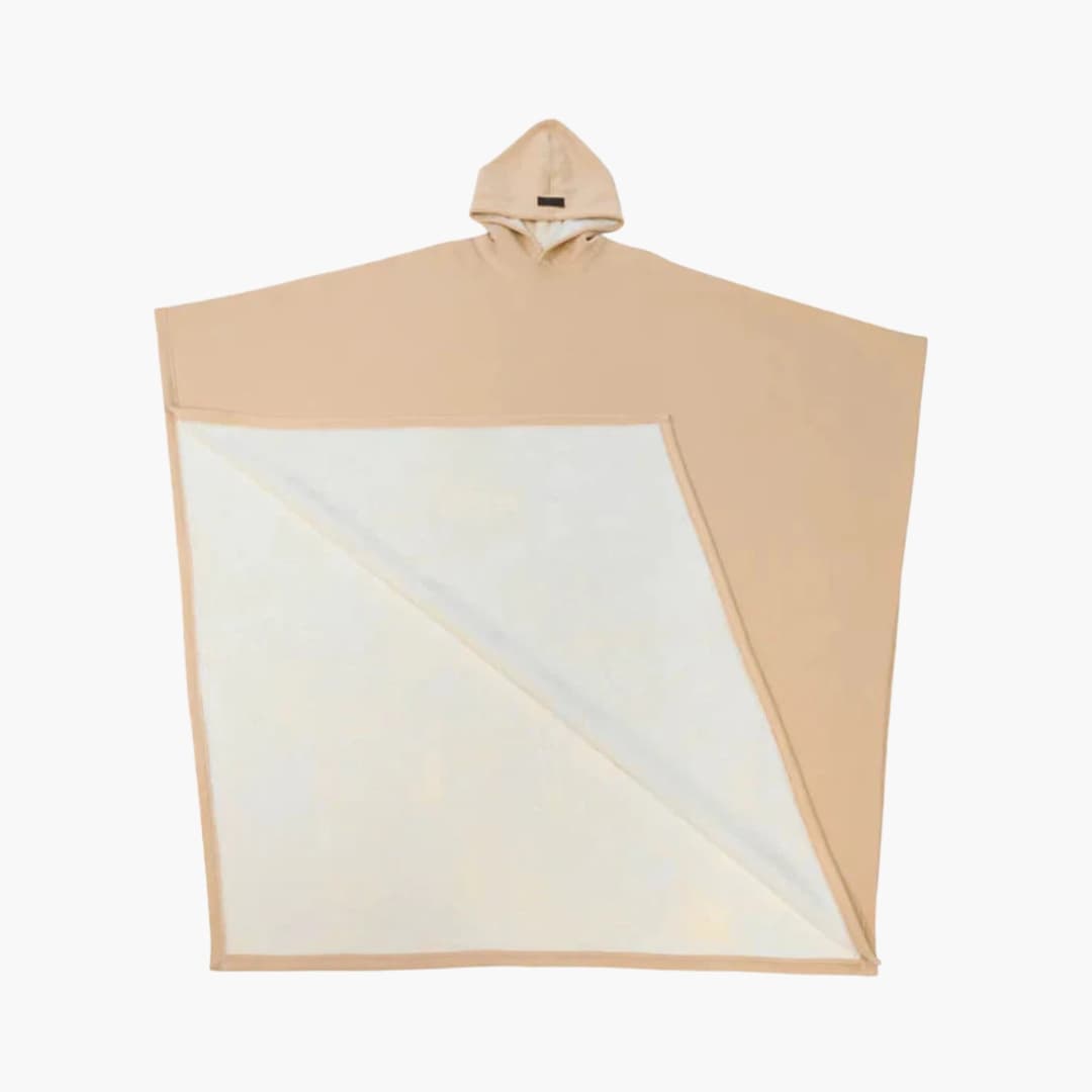 Diese Unisex Poncho-Decke besitzt eine angesetzte Kapuze und einen rechteckigen Oversize-Schnitt. Die weiten Öffnungen an den Seiten formen kurze Ärmel. Auf der Vorderseite befindet sich ein diagonal abgenähtes Paneel. Die Kanten sind mit Einfassungen versehen, und die gesamte Oberfläche zeigt eine gleichmäßige gewebte Struktur.