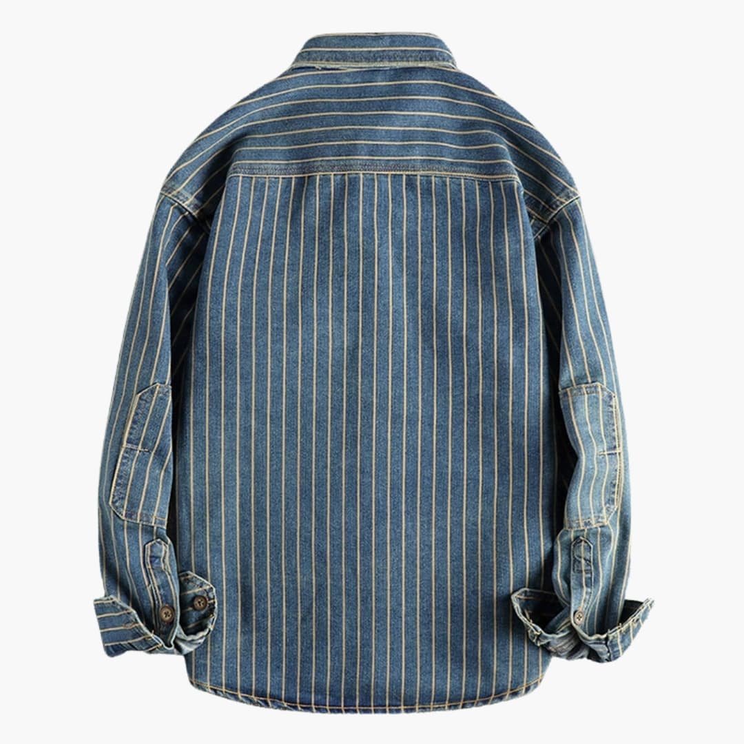 Dieses Herrenhemd verfügt über einen spitzen Kragen und eine durchgehende Knopfleiste auf der Vorderseite. Zwei Brusttaschen mit Knopfverschluss sind integriert. Die langen Ärmel sind mit Knopfmanschetten versehen, während der Saum abgerundet geschnitten ist. Das gesamte Hemd zeigt eine vertikal gestreifte, gewebte Oberfläche mit sichtbaren Nähten.