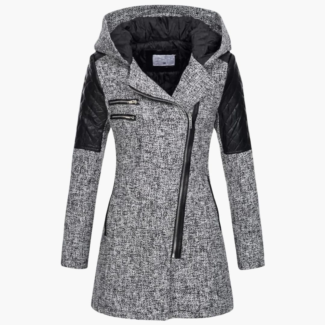 Dieser Damenmantel ist mit einer Kapuze und einem asymmetrischen Frontreißverschluss ausgestattet. Zwei horizontale Brusttaschen sowie zwei Seitentaschen sind in das Design integriert. Die langen Ärmel besitzen gesteppte Einsätze im oberen Bereich. Der gerade Saum reicht bis unter die Hüfte, während die Oberfläche eine gewebte Struktur mit texturierter Optik zeigt.