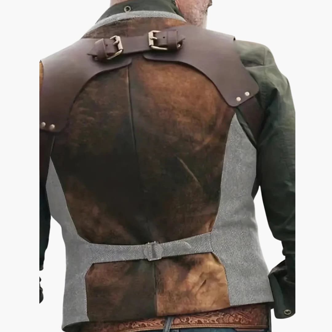 Diese Herren Weste hat einen V-Ausschnitt und eine Knopfleiste an der Vorderseite. Sie ist im Wendestil gestaltet und bietet zwei Oberflächenvarianten, darunter ein Patchwork-Detail. Der ärmellose Schnitt mit offenen Armausschnitten und geradem Saum sorgt für eine reguläre Länge mit schlichter Musteroptik.