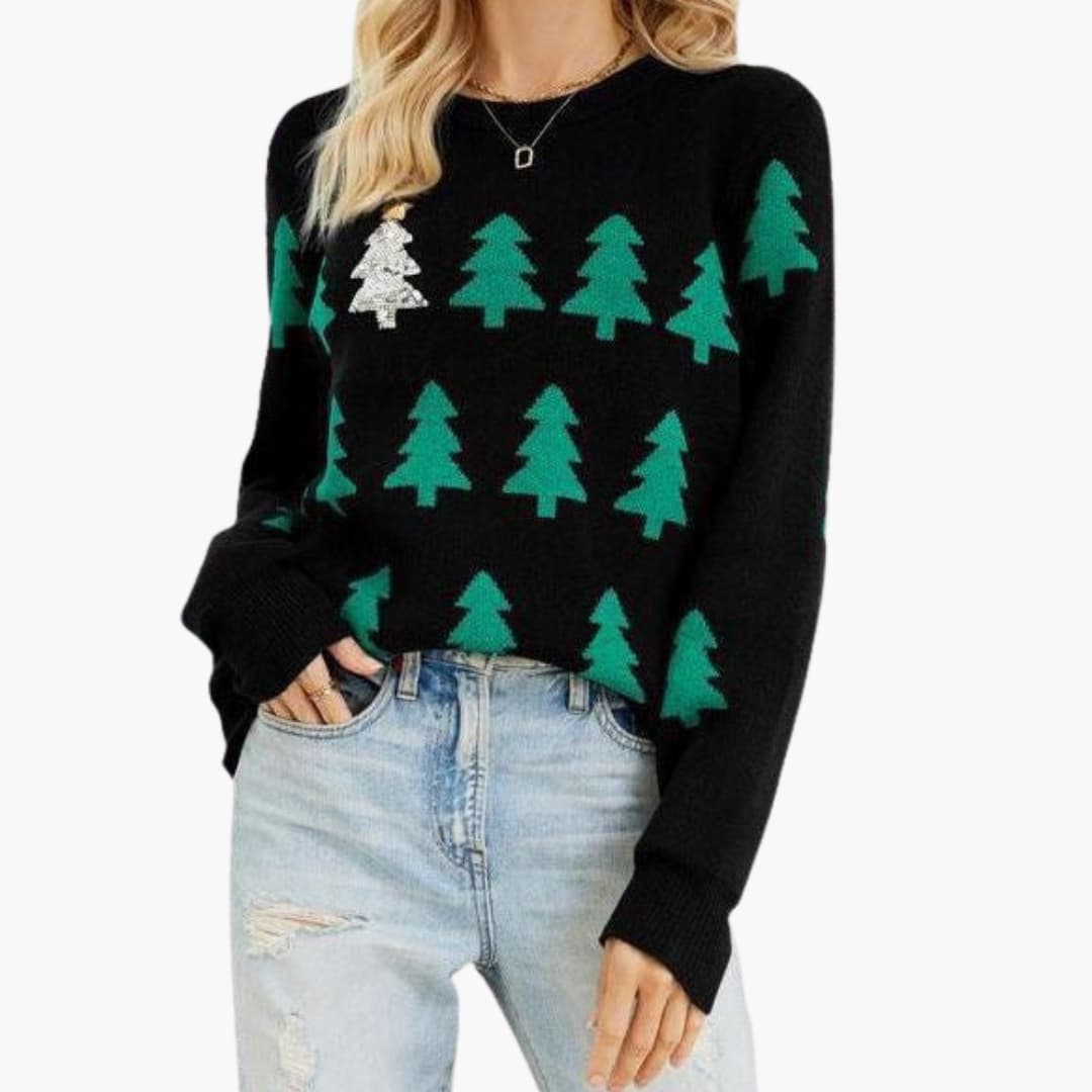 Gestrickter Damenpullover mit Baum Motiv für die Festtage